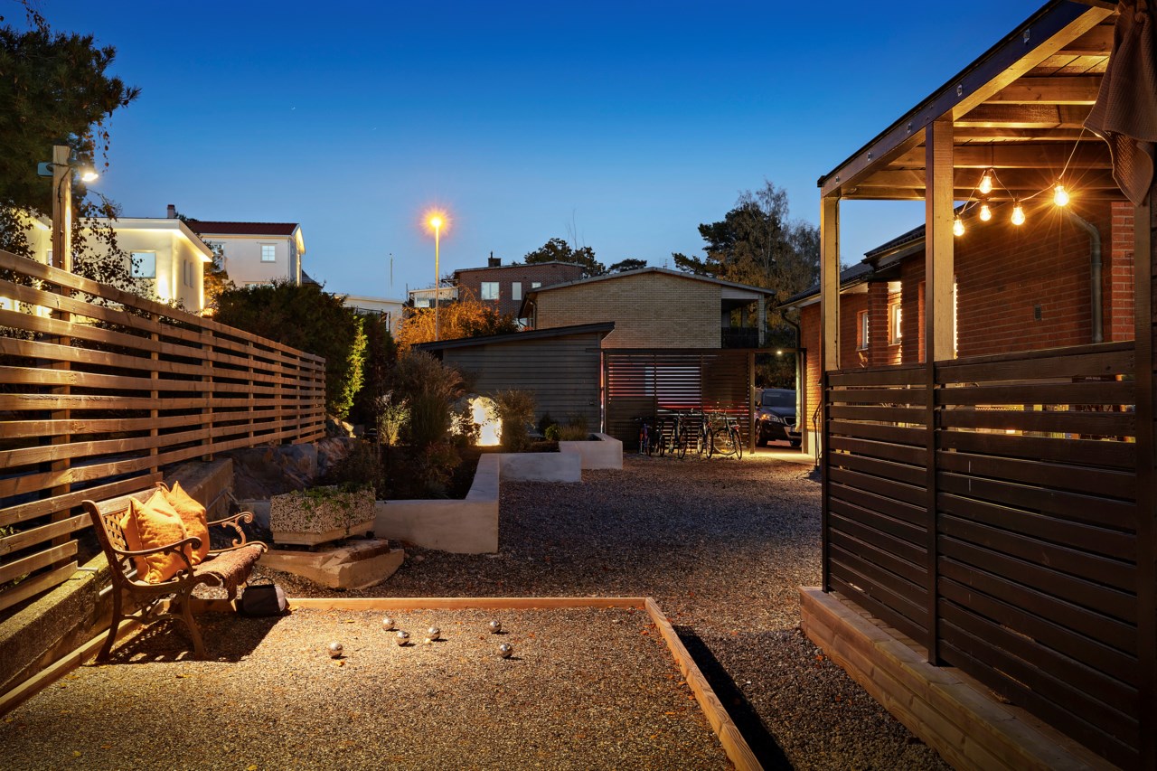 I centrum står en 4 x 8 meter stor pool med helgaveltrappa, klädd med liner i Persian Black och utrustad med RibCover. Runt poolen skapades cirka 200 kvadratmeter trädäck i två nivåer, kompletterat med pergola, utekök och en boulebana som ger plats för både vardag och umgänge.