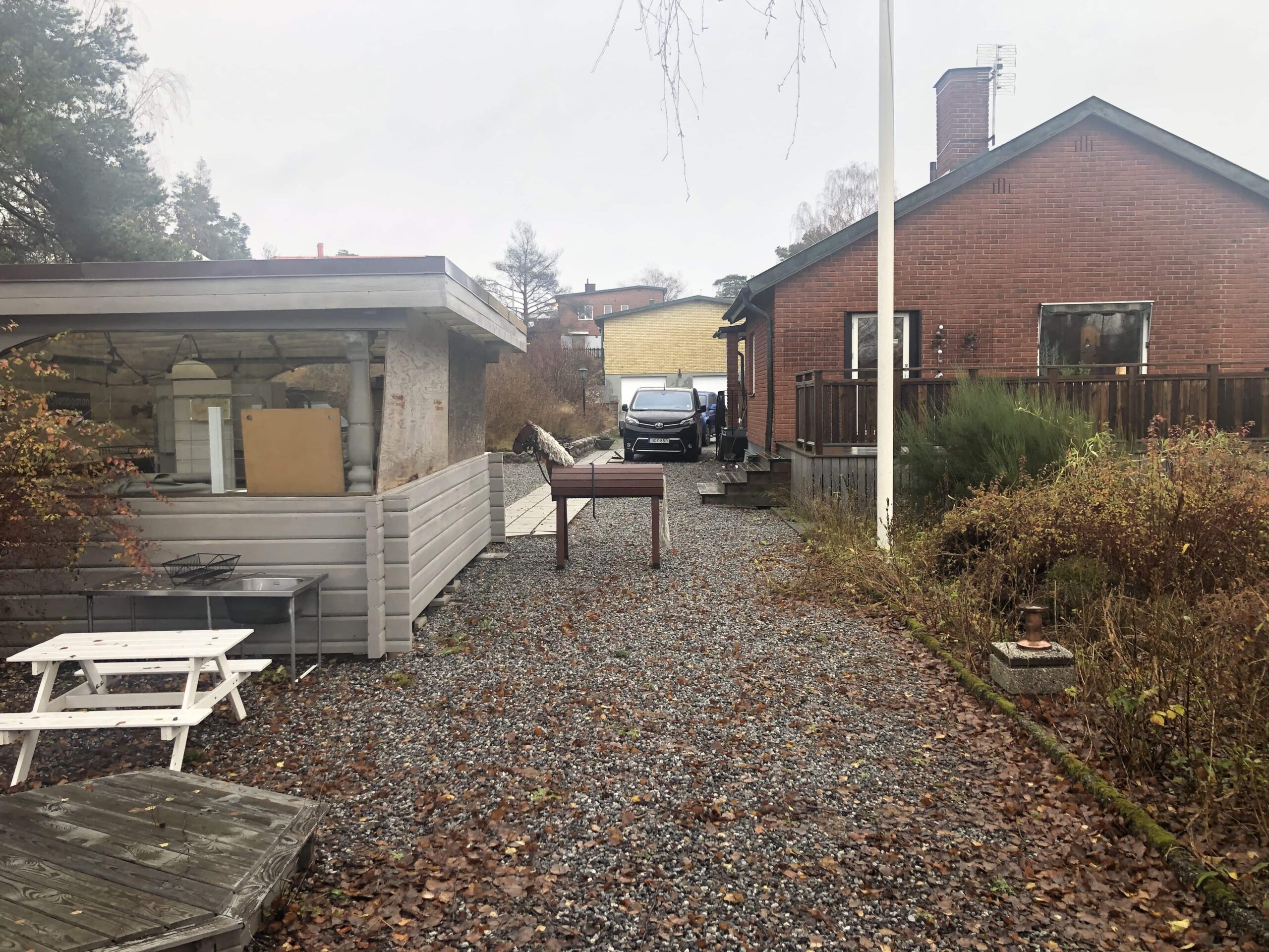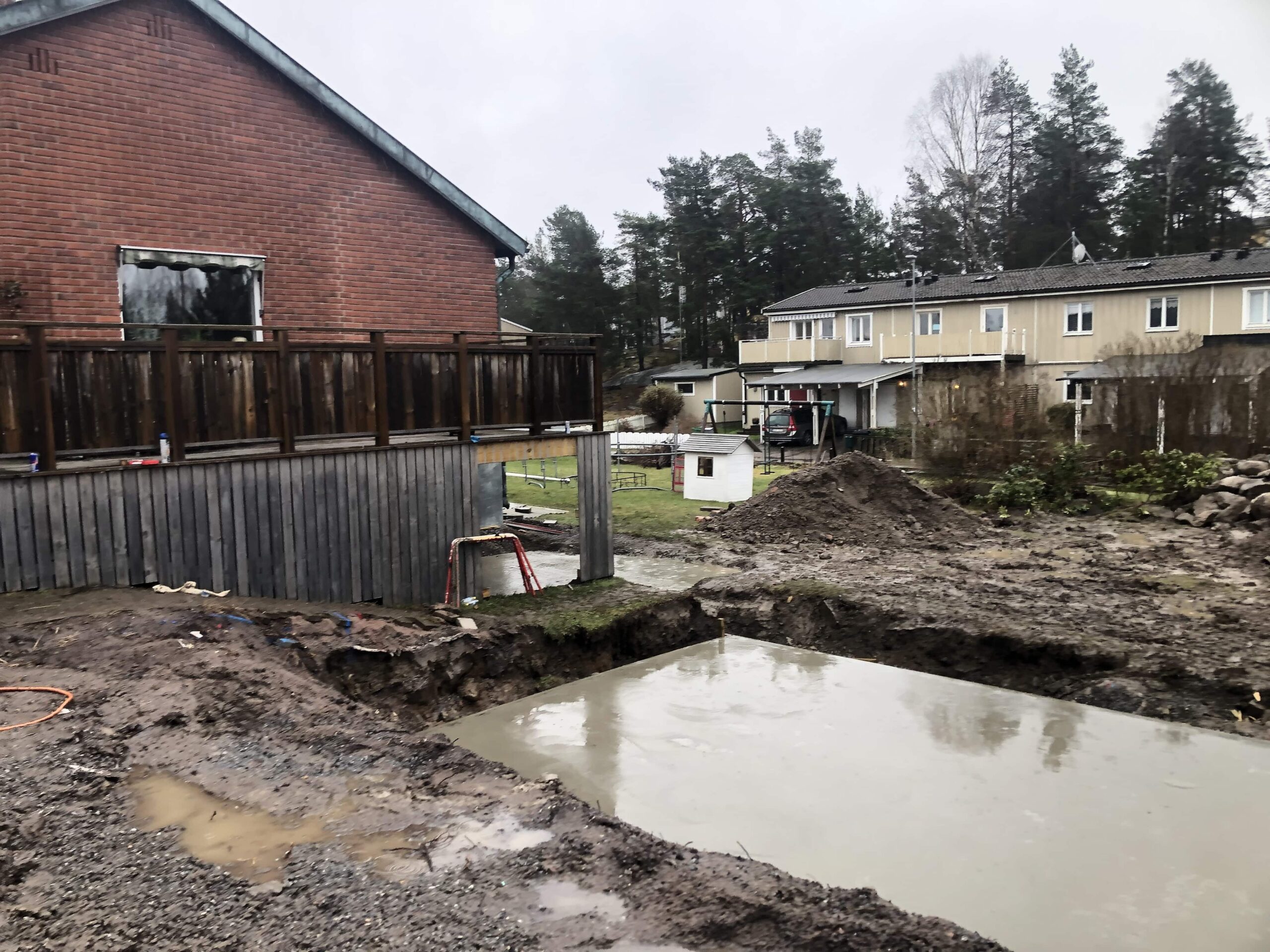 Projektet omfattade även rabatter med gjuten stödmur, anläggning av grusgångar, kantstöd i svetsad cortenstål samt staket och insynsskydd. Tomten färdigställdes med plantering av thujahäck, finplanering, sådd av gräsmatta och byggnation av friggebod. Resultatet är en genomtänkt helhet där poolen är en naturlig del av en helt ny utemiljö.