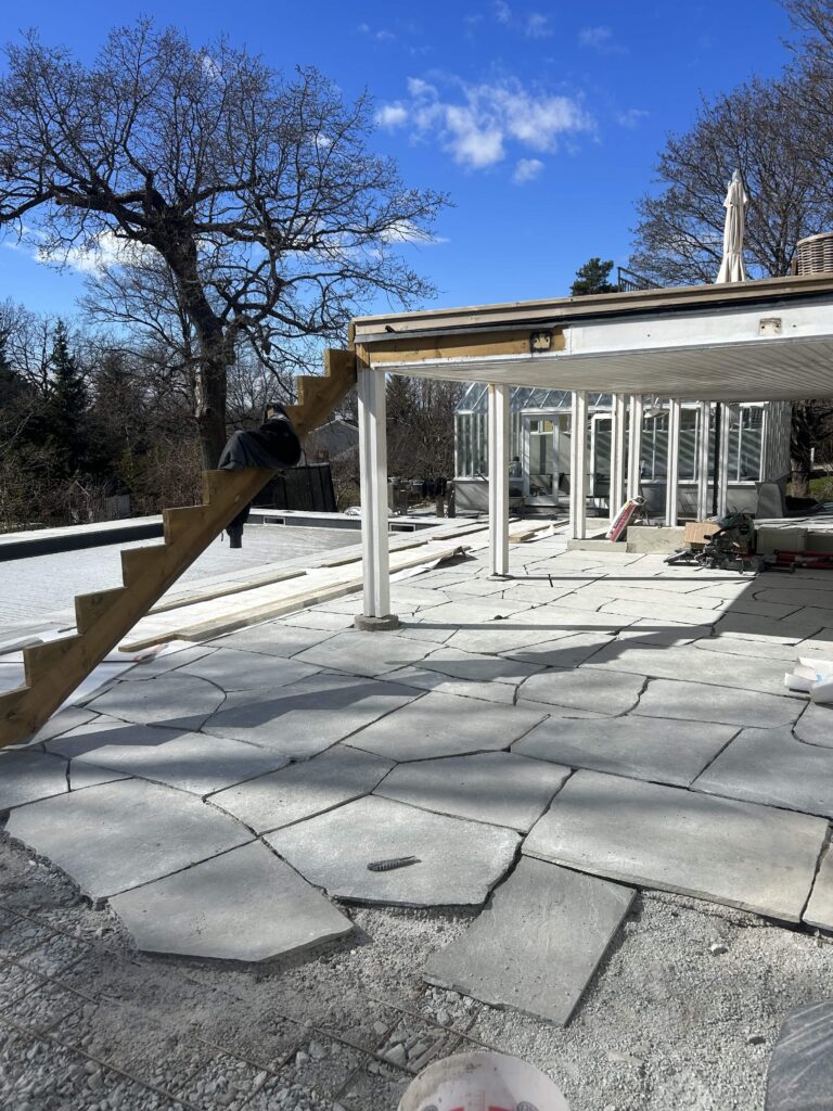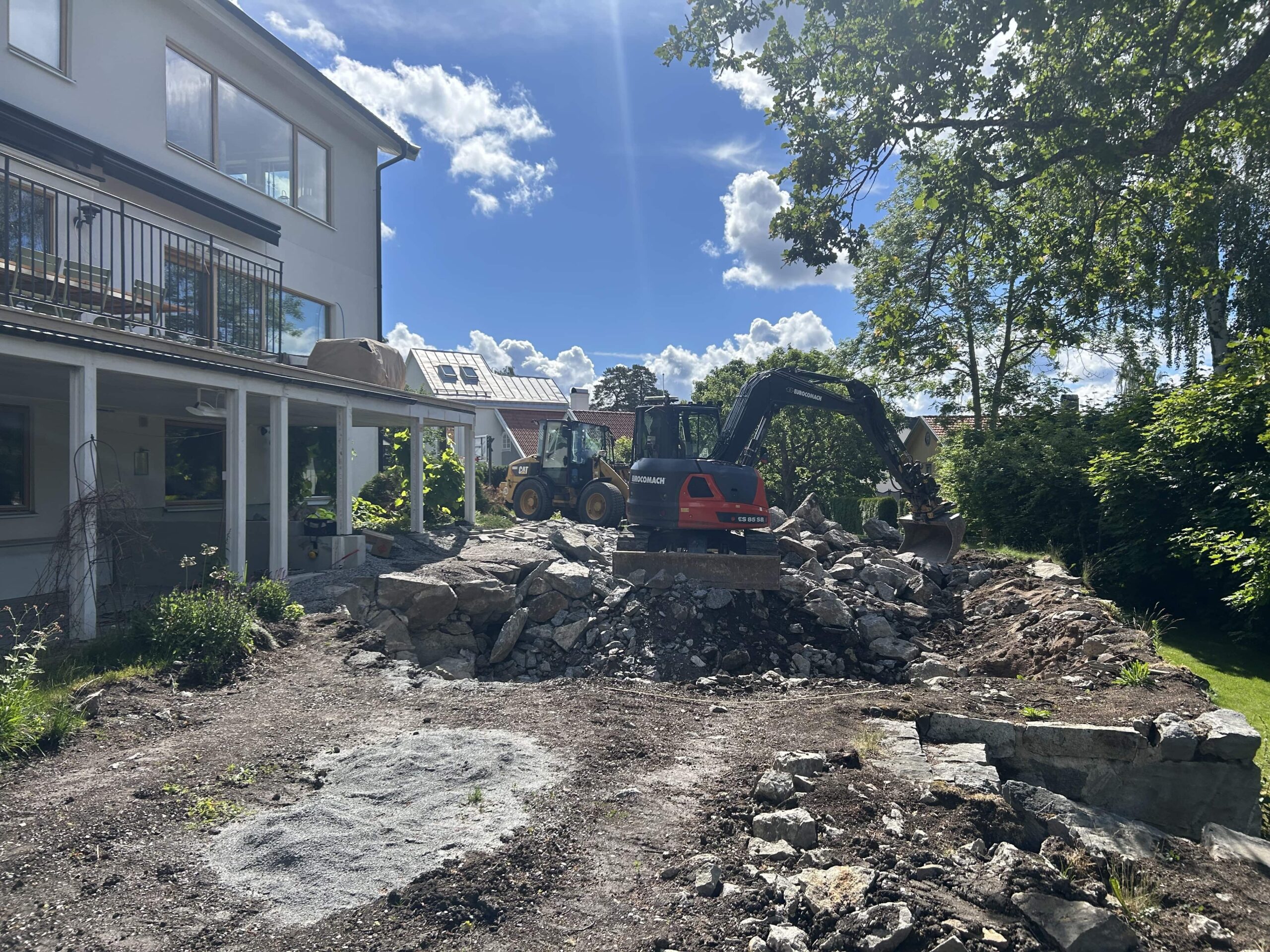 I Täby fick vi uppdraget att bygga en pool på en tomt där förutsättningarna visade sig vara mer utmanande än väntat. Under ett tunt matjordslager på cirka tio centimeter fanns berg, vilket krävde omfattande spräng- och fräsningsarbete innan byggnationen kunde ta ta vid.