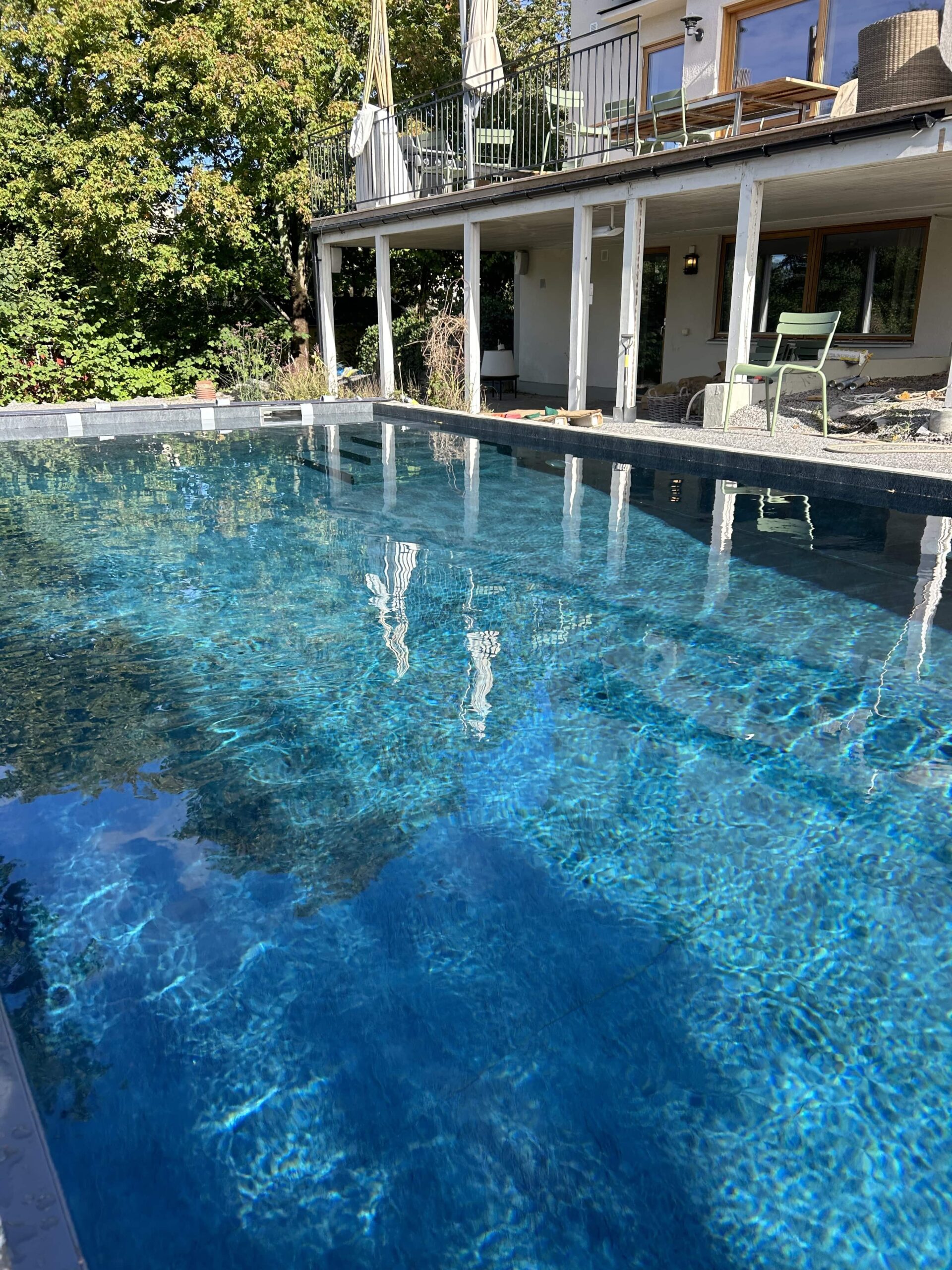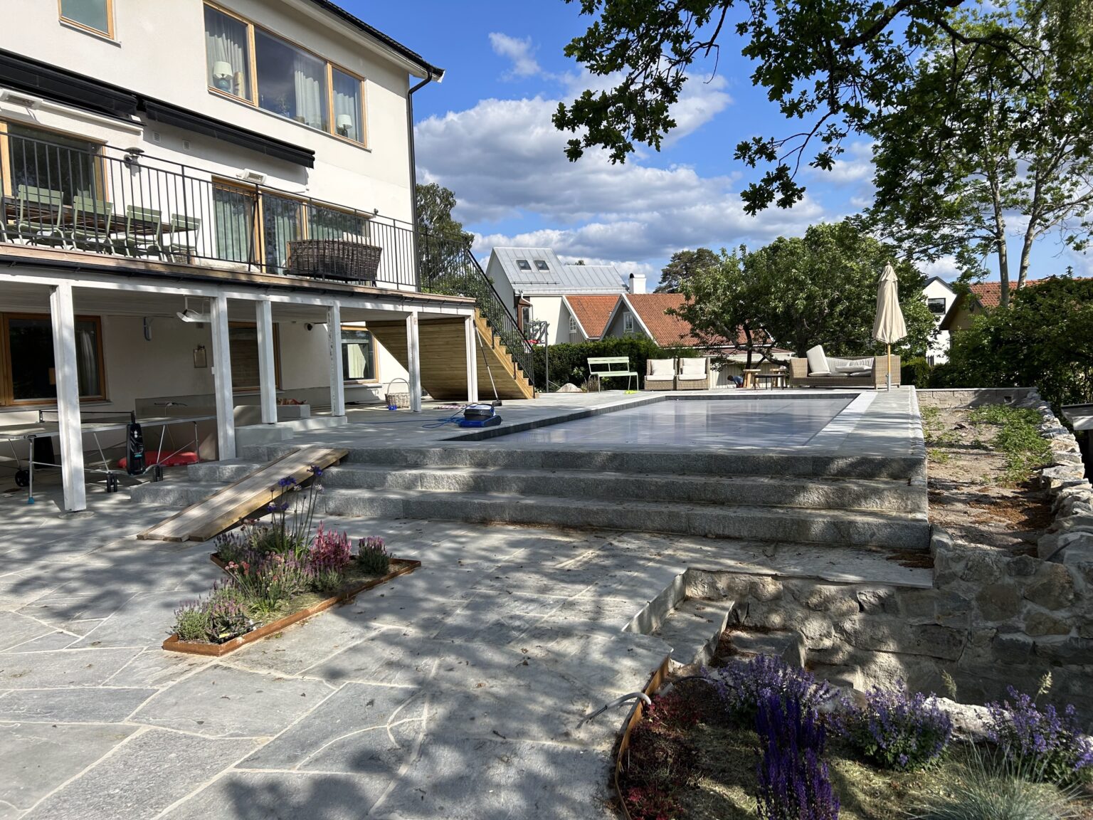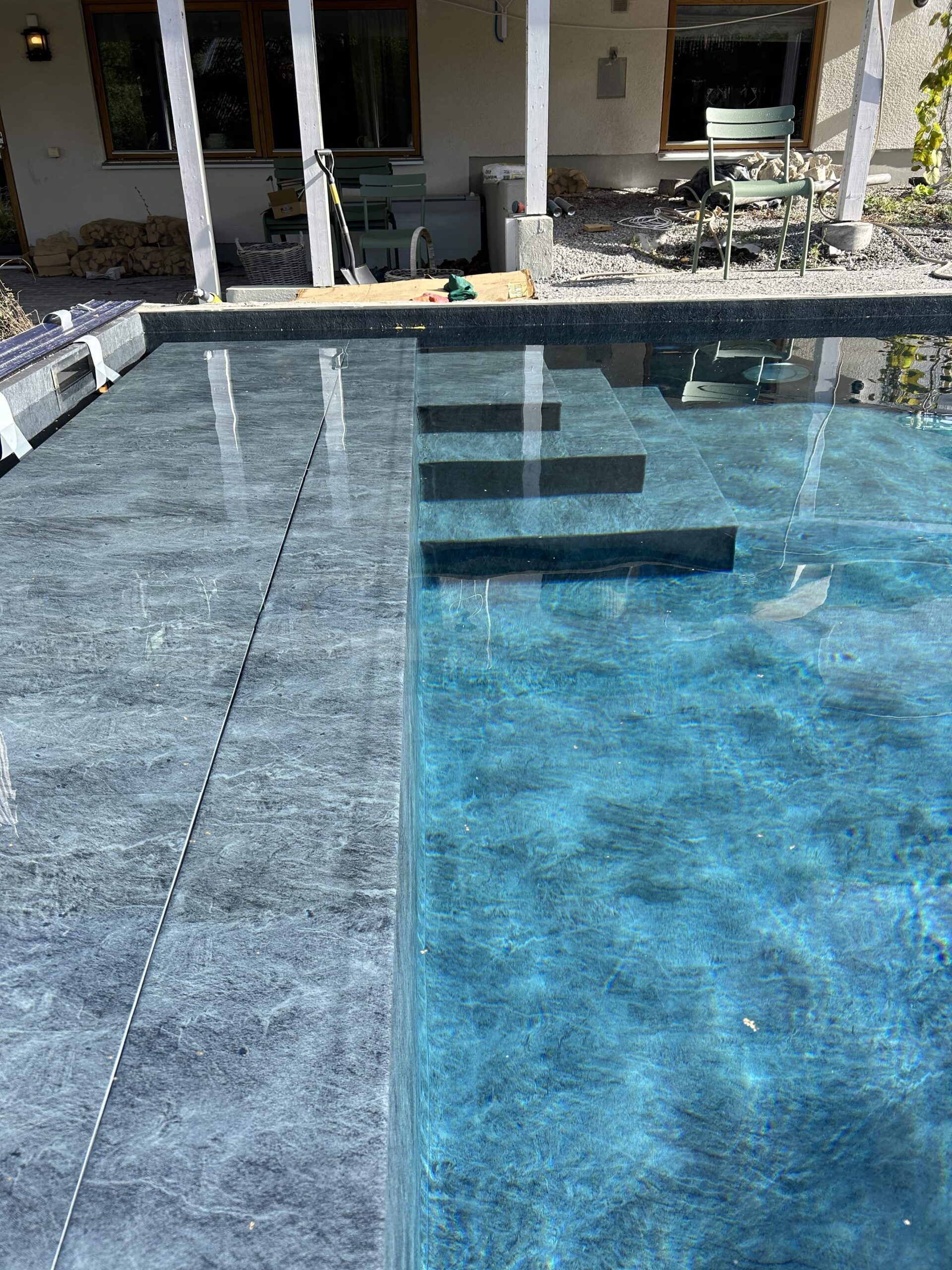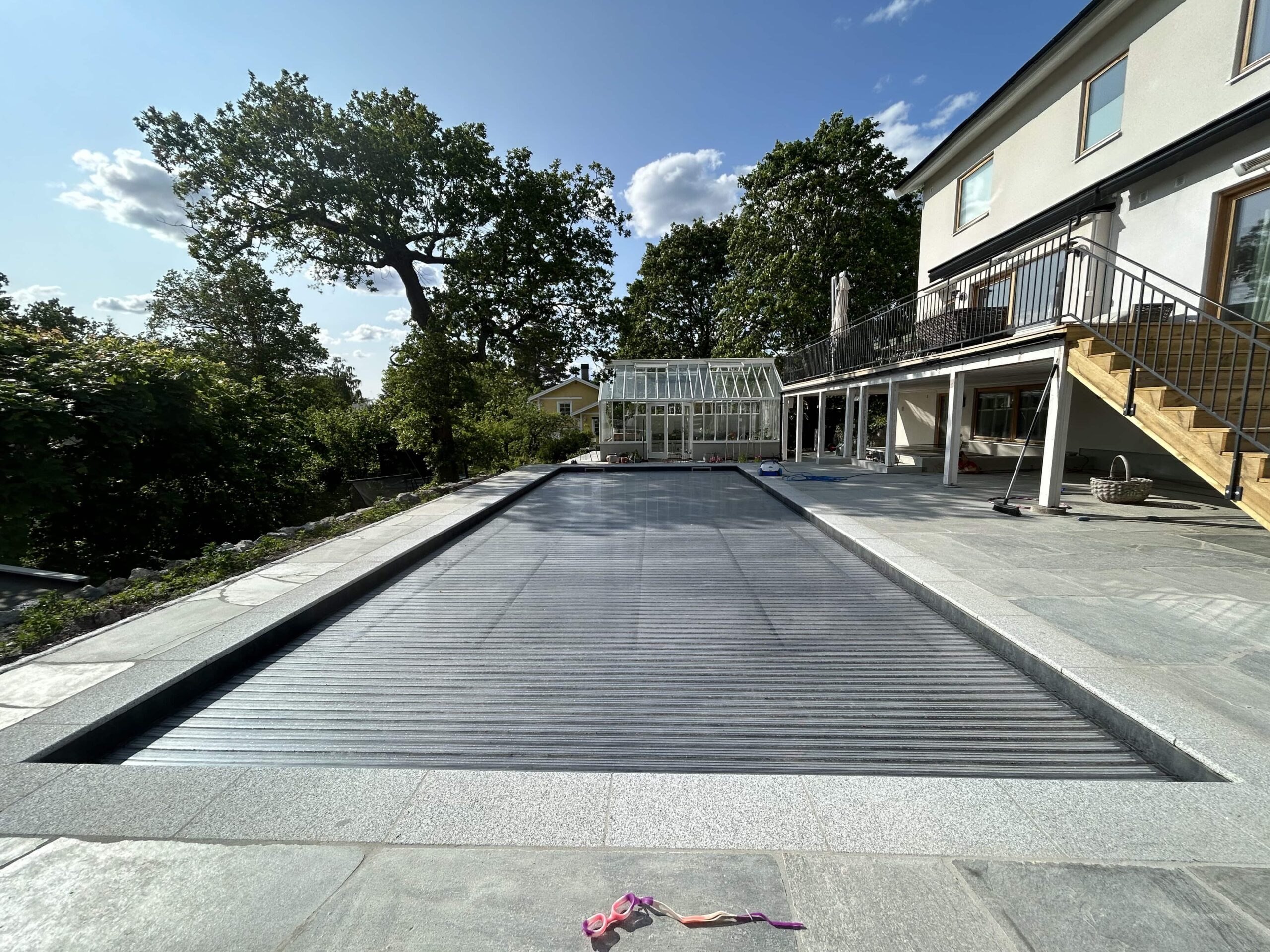 Poolen utrustades med ett inbyggt lamelltäcke i trappan, en specialbyggd kubformad trappa samt svetsad liner Renolit Elegance. Anläggningen kompletterades med en helautomatiserad tekniklösning samt finplanering av tomten med oregelbunden skiffer, uppbyggnad av terrass och gjutning av grund för växthus. Ett projekt där platsens utmaningar blev en förutsättning för ett starkt slutresultat.