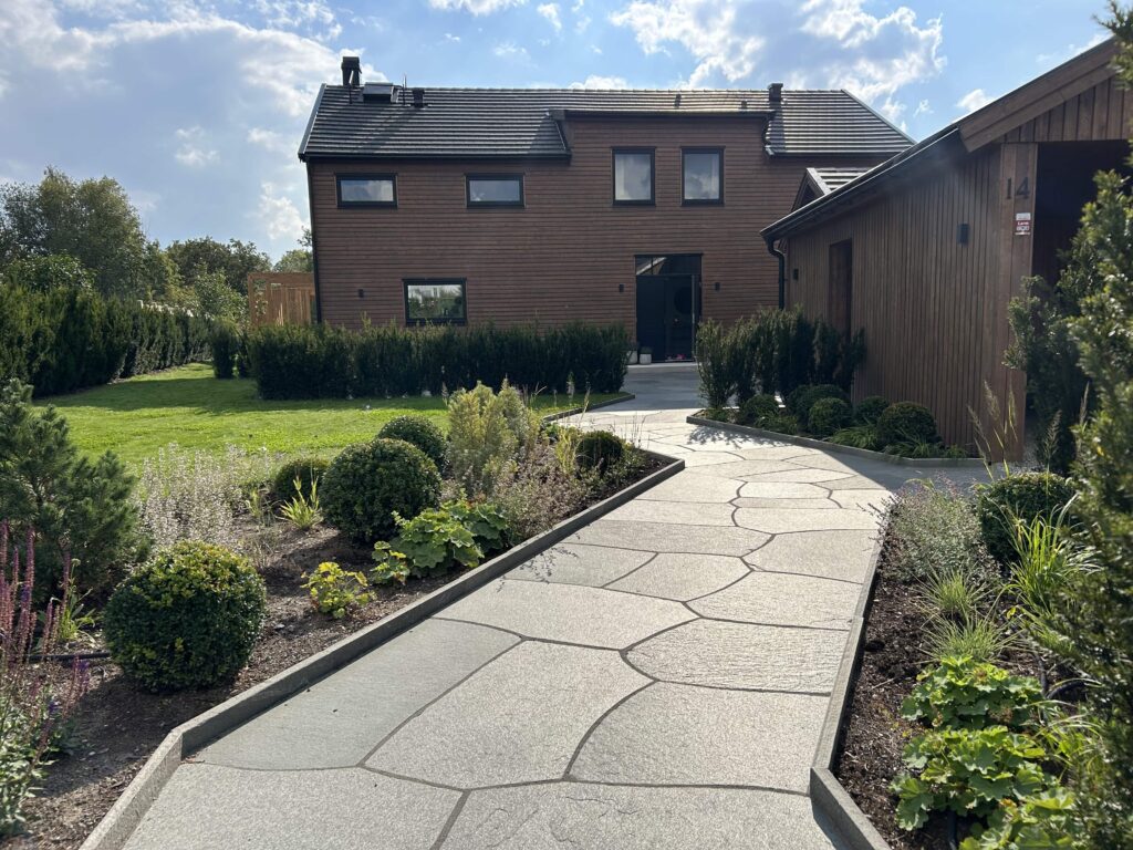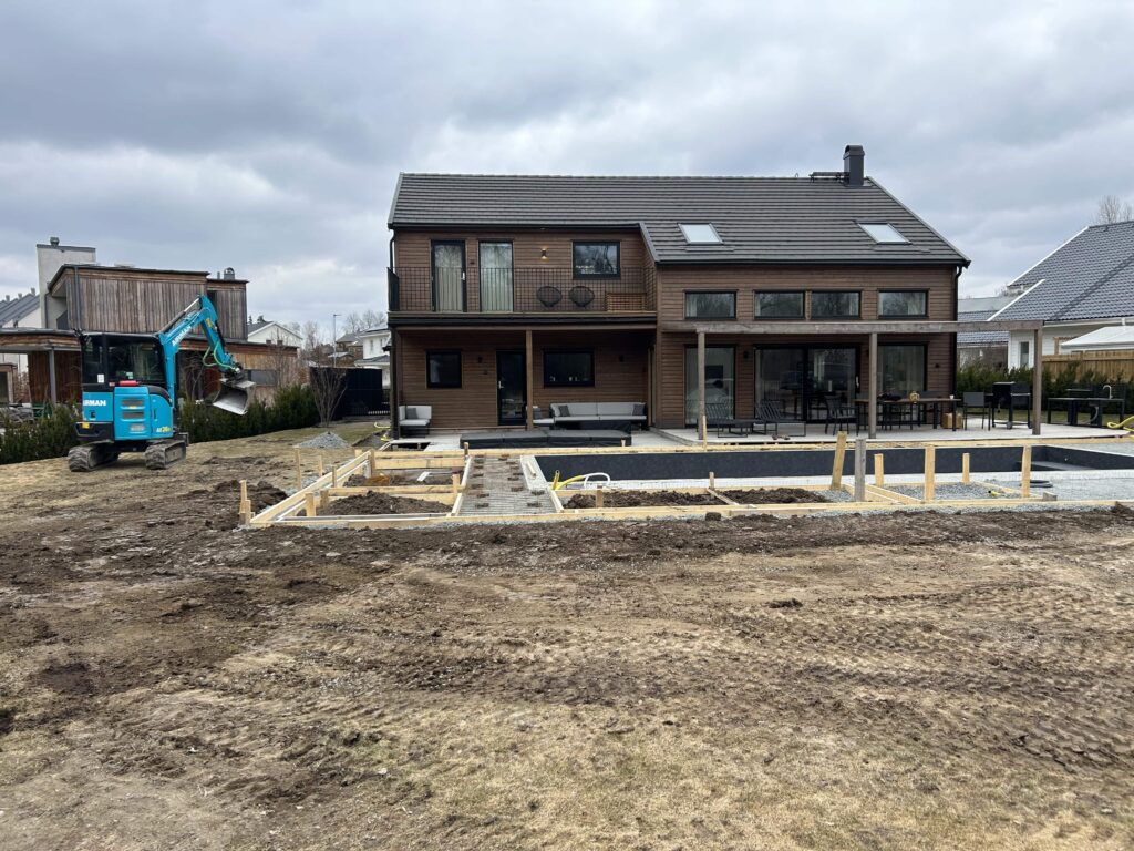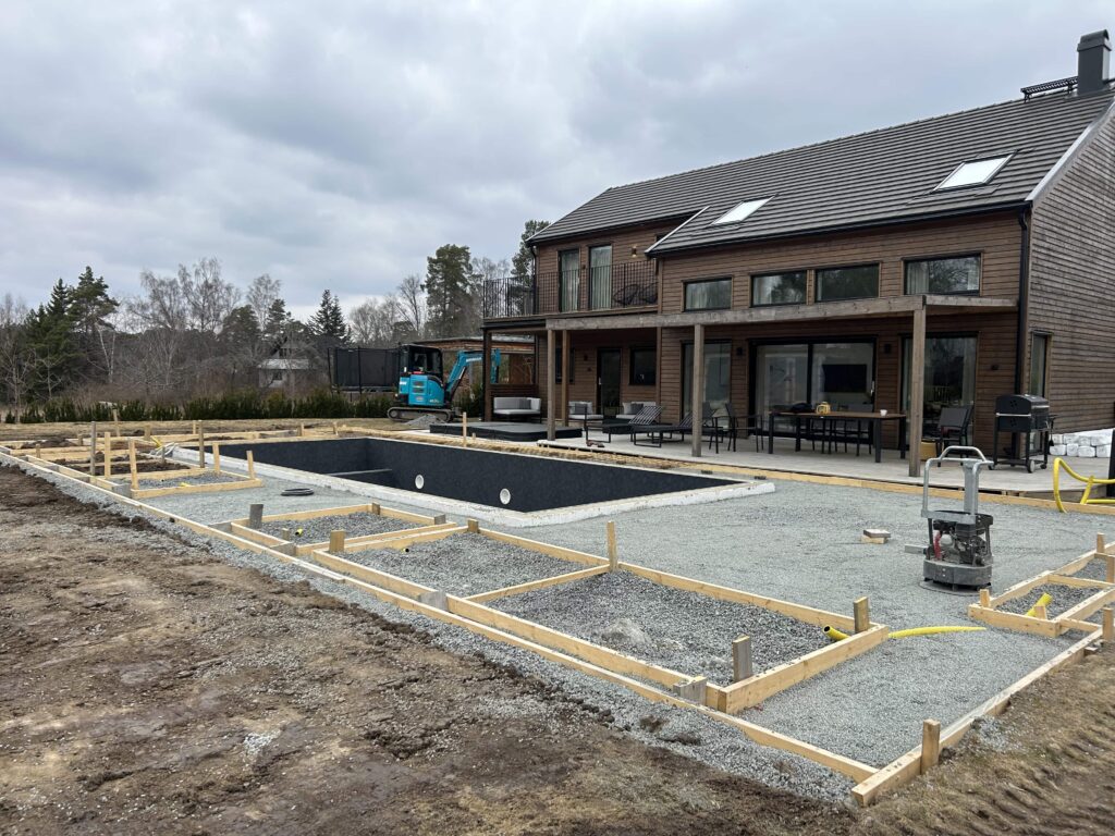 Projektet inleddes med omfattande markarbeten, där gångar i oregelbunden skiffer förbereddes, en gjuten altan med tio integrerade rabatter formades samt schakt och grovplanering utfördes för trädgårdens framtida utformning. Under våren fortsatte arbetet med byggnation av en 4 x 10 meter stor pool, installation av nedsänkt lamelltäcke på botten samt formsättning och gjutning av altan.