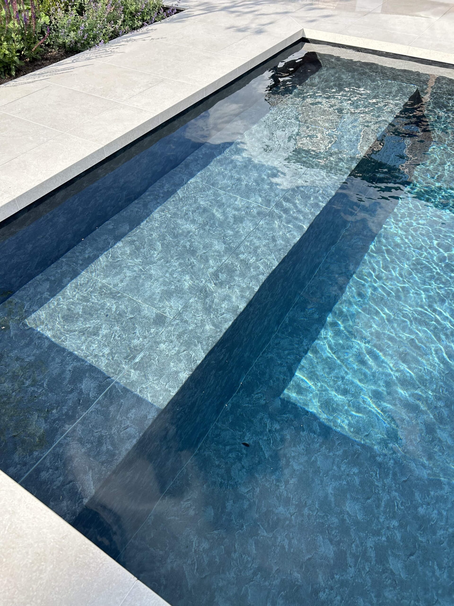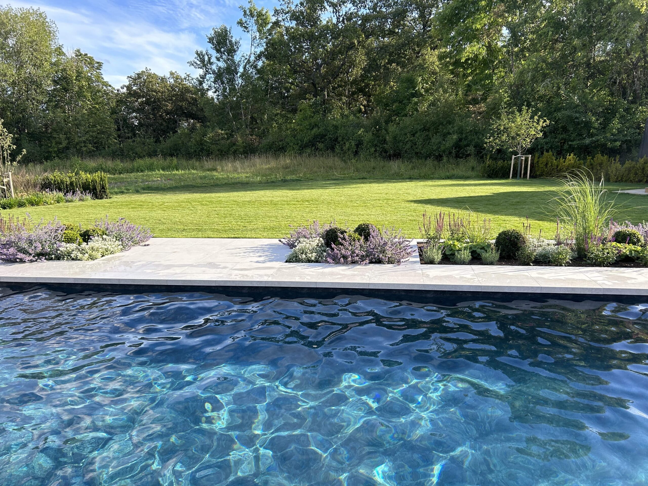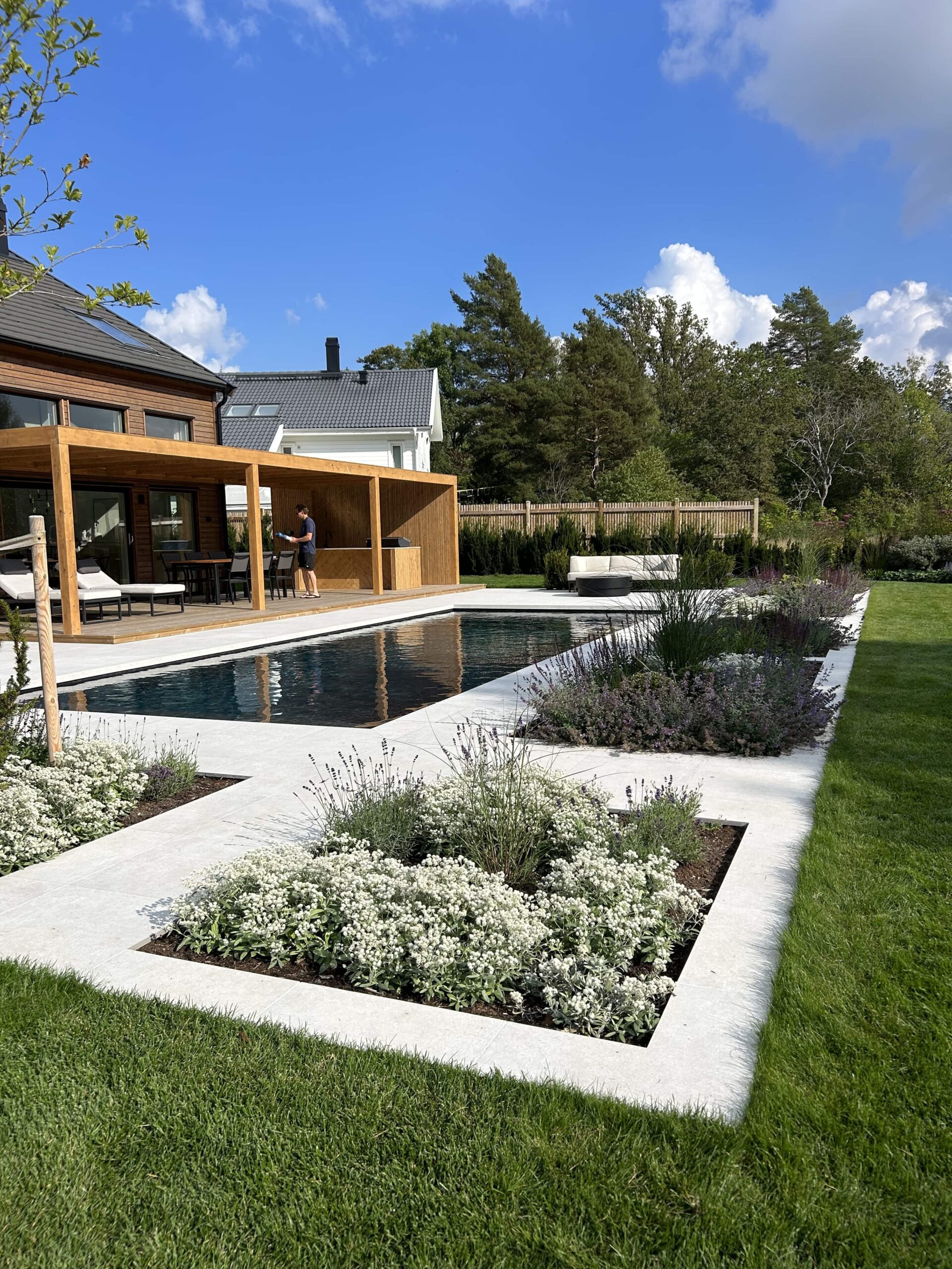 Poolområdet färdigställdes med plattläggning i Luna Pearl från Scandirock och rak kantsten som ger ett sammanhållet och exklusivt intryck. Poolen kläddes med svetsad liner i Black Slate från CGT. Ett stort och komplext projekt som blev särskilt lyckat tack vare ett nära samarbete med en engagerad kund och en tydlig vision från start.